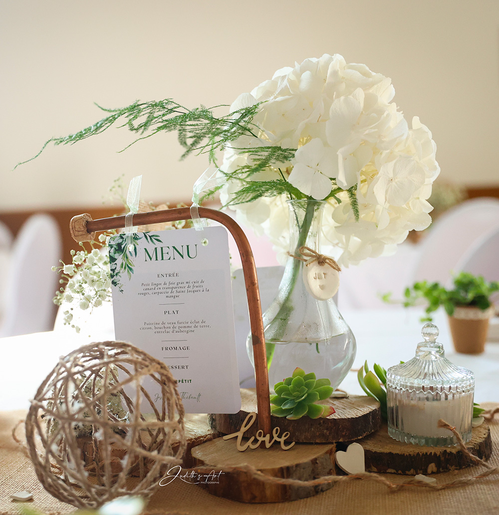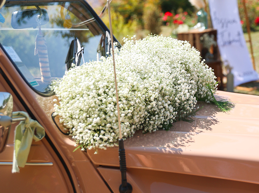 - Une décoration globale et harmonieuse : arche florale, centre de table, coin photo, entrée, plan de table, buffet, voiture…